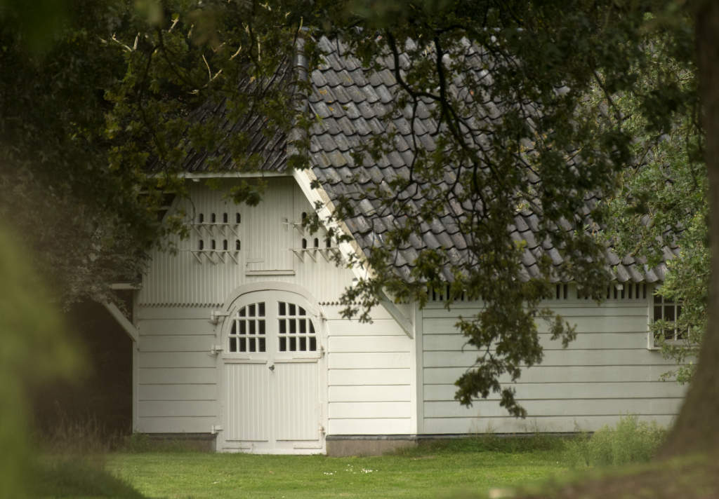 Gepotdekselde houten schaapskooi met duivenzolder. In de noordgevel een rondboogvormige baander, in het verticale beschot in de geveltop een hooiluik met aan weerszijden acht duivenpoortjes.