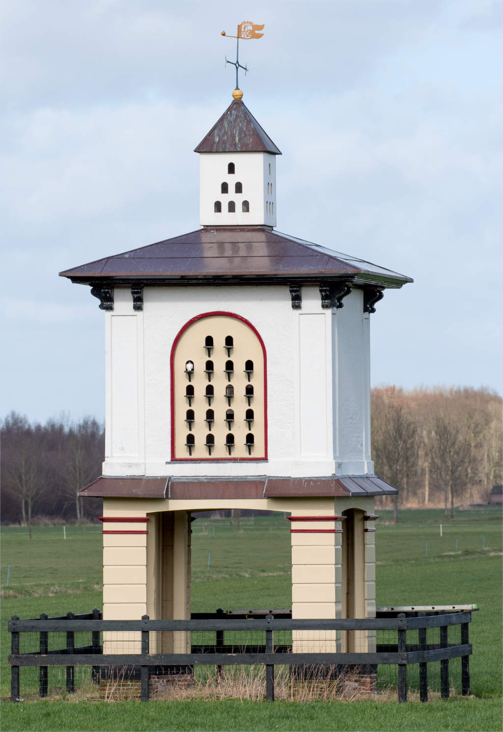 Vrij in het weiland staande duiventil uit het midden van de 19de eeuw. De duiventil staat recht tegenover de tuinmanswoning. De til bestaat uit een onderstel en een vierkant bakstenen duifhuis onder vrij plat overstekend tentdak op consoles. Hierop een vierkant torentje eveneens onder tentdak met windvaan.