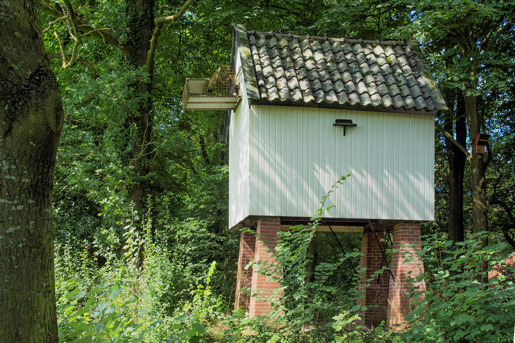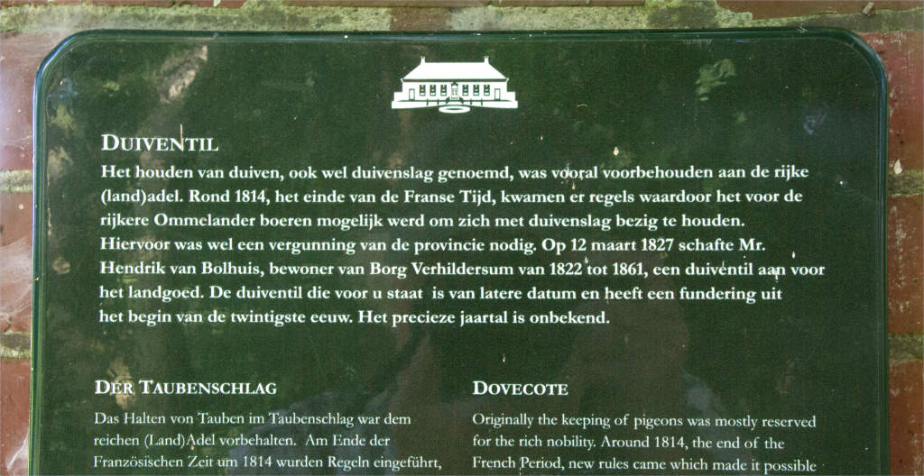 De duiventil uit (oorspronkelijk uit 1827) is gesitueerd direct buiten de buitengracht op de zuidoosthoek.