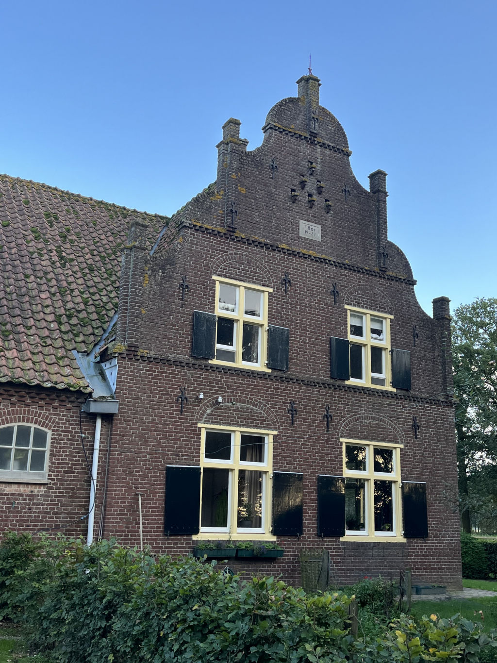 Ter hoogte van de vliering zijn in de gevel zes duivengaten aangebracht alsmede een gedenksteen met het opschrift: T HOF / 1927".