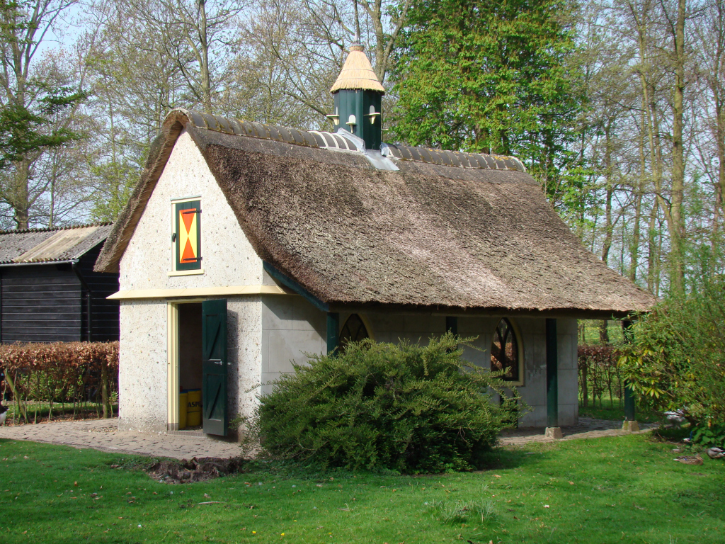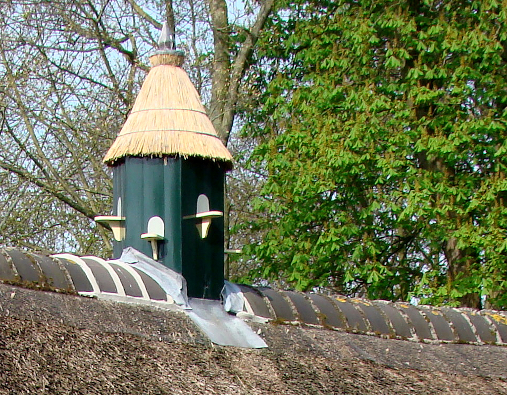 Op het dak staat een zeskantige houten duiventil met een rieten paraplukap.
