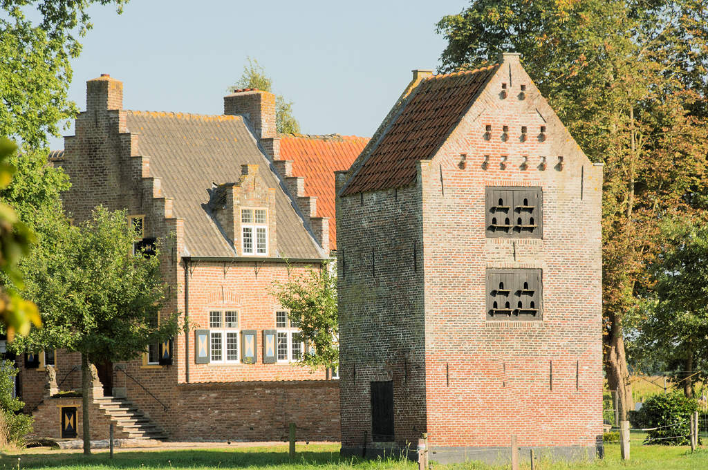 Voor de boerderij staat een uit groot formaat handvorm baksteen opgetrokken duiventoren van drie bouwlagen De invlieggaten zitten in de geveltop, aAan één kant van de toren bevindt zich een toegangsdeur. De duiventoren dateert uit de 17de eeuw.