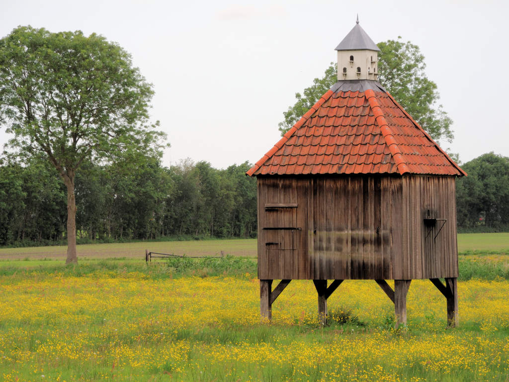 Vollenhove – Oldenhof Aan de provinciale weg van Vollenhove naar Zwartsluis kondigen een duiventil in een weiland en een bosschage van oude knoestige bomen de aanwezigheid aan van de voormalige havezate de Oldenhof Meer informatie: Stadvollenhove.nl